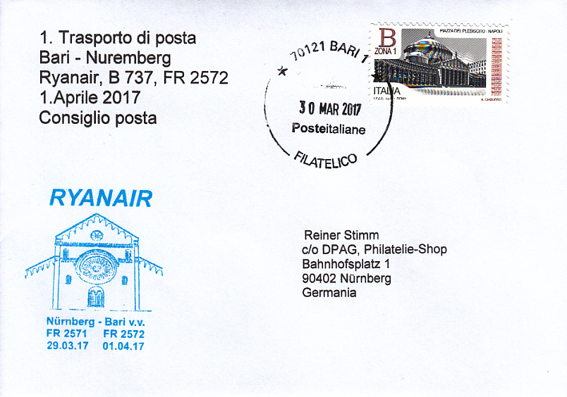 Erstflugpost; Ryanair; Bari - Nürnberg; |